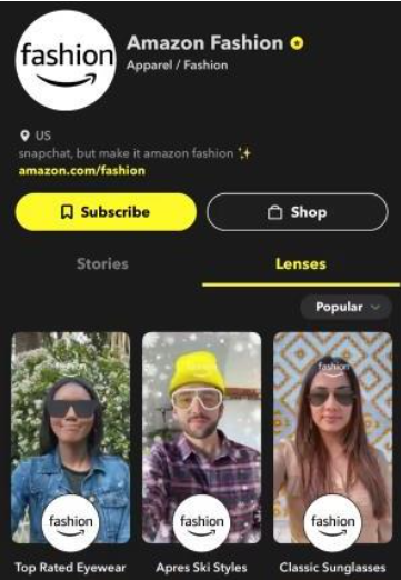 新的虚拟穿戴AR滤镜包含数千种亚马逊时尚流行的虚拟试戴眼镜产品,使亚马逊品牌能够利用其亚马逊AR资产,并以有趣的互动体验向数百万 Snapchat 用户展示风格。客户将能够直接在 Snapchat 上探索、购买和数字试戴数千种眼镜款式,然后在亚马逊时尚商店无缝购买。