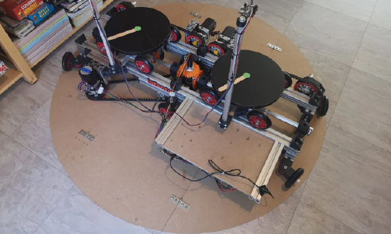 为了重现行走的感觉,Taco VR 平台具有一系列电机,用于连续旋转的滑环,还有 Arduino Mega 2560 Rev3 微控制器板和两个 pixy2 摄像头,可跟踪用户在 VR 中迈出的每一步并将平台移动到脚下。